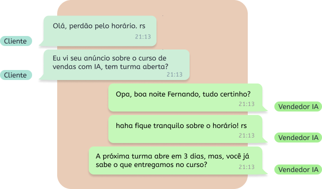 Conversas fluidas e simples sem jargões técnicos, mantendo sempre um tom de voz amigável para o cliente.
